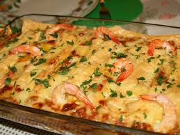 1.Ponha o queijo parmesão fresco ralado por cima da lasanha já montada e decore com os camarões feitos no azeite, junto com um ramo pequeno de coentro entre eles
